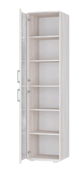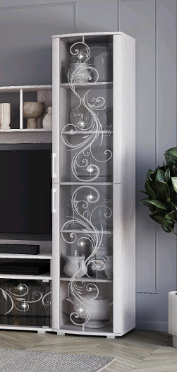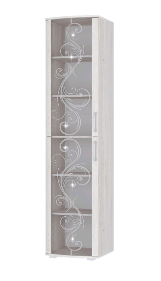 модель из одноименной мебельной коллекции имеет распашные дверцы из тонированного стекла, украшенного пескоструйным рисунком и стразами,