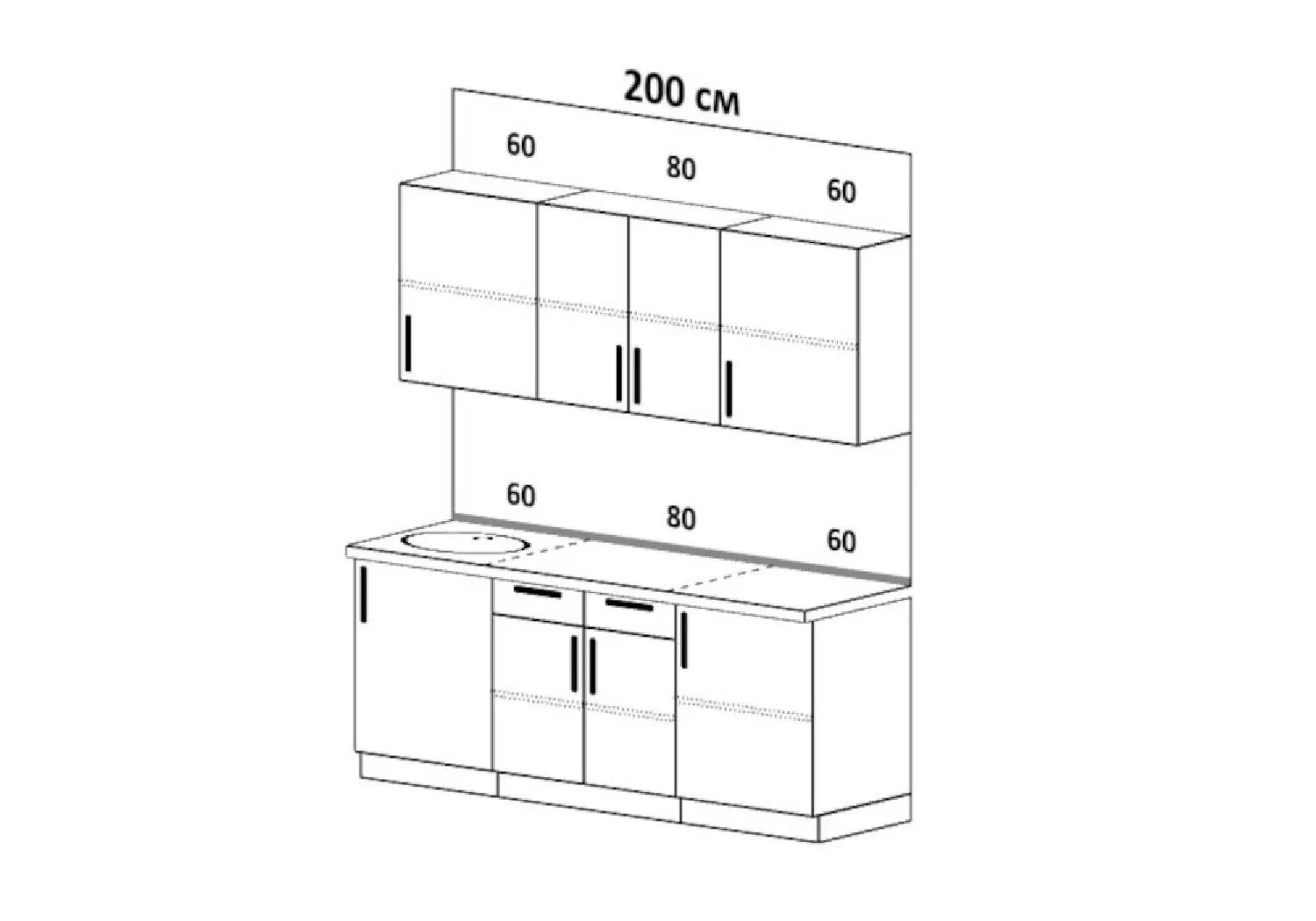 | В комплект входит | Верхние модули (ШхВхГ): , , ШВ1Д600 - 60 х 71.8 х 28 см - 2 шт., ШВ800 - 80 х 71.8 х 28 см - 1 шт., , Нижние модули (ШхВхГ):, , ШНМ1Д600 - 60 х 82 х 42.5 см - 1 шт., ШН2Я800 - 80 х 82 х 42.5 см - 1 шт., ШН1Д600 - 60 х 82 х 42.5 см - 1 шт., , Столешница 200 см - 1 шт. |