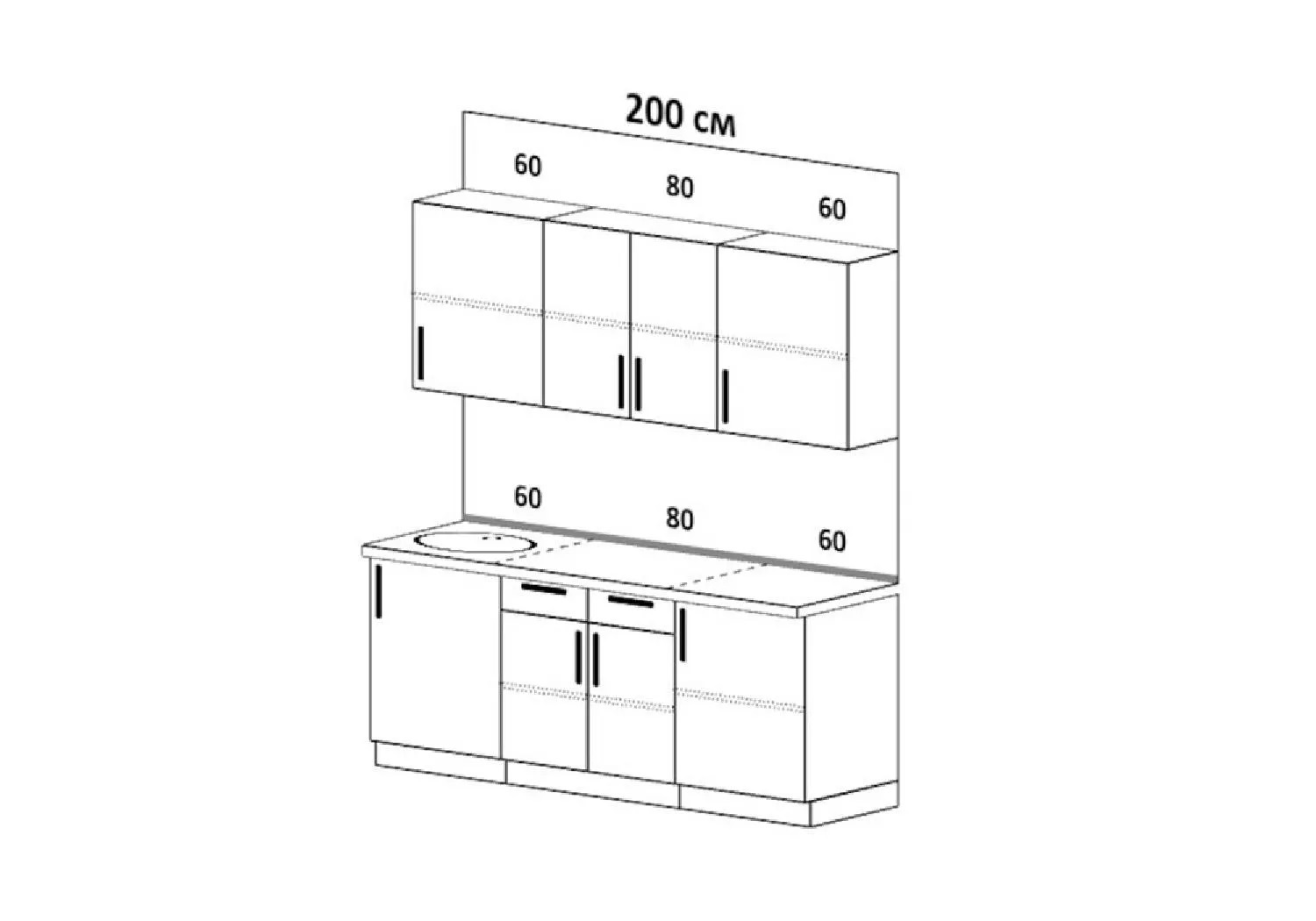 | В комплект входит | Верхние модули (ШхВхГ): , , ШВ1Д 600 - 60 х 71.8 х 28 см - 2 шт., ШВ 800 - 80 х 71.8 х 28 см - 1 шт., , Нижние модули (ШхВхГ):, , ШНМ1Д 600 - 60 х 82 х 42.5 см - 1 шт., ШН2Я 800 - 80 х 82 х 42.5 см - 1 шт., ШН1Д 600 - 60 х 82 х 42.5 см - 1 шт., , Столешница 200 см - 1 шт. |