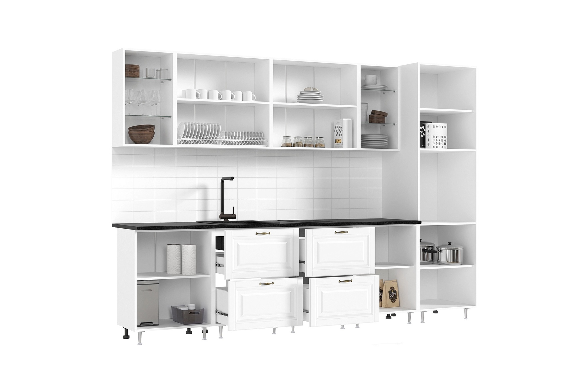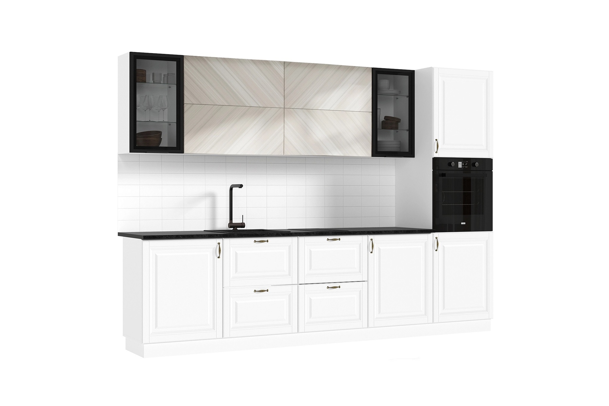 | Дополнительно | Высота нижних модулей указана с учетом высоты опор и столешницы., Глубина модулей указана с учетом толщины фасада., Цоколь в комплект не входит. |
