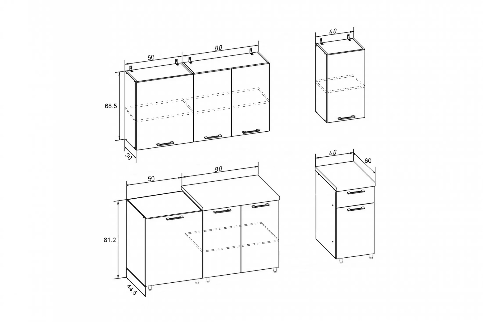 | В комплект входит | Верх (ШхГхВ):, ШВС 800 80 х 30 х 68.5 см - 1 шт;, ШВ 400 40 х 30 х 68.5 см - 1 шт.;, ШВ 500 50 х 30 х 68.5 см - 1 шт.;, , , Низ (ШхГхВ):, ШНМ 500 50 х 44.5 х 81.2 см - 1 шт.; , ШН 800 80 х 44.5 х 81.2 см - 1 шт.;, ШН1Я 400 40 х 44.5 х 81.2 см - 1 шт. |