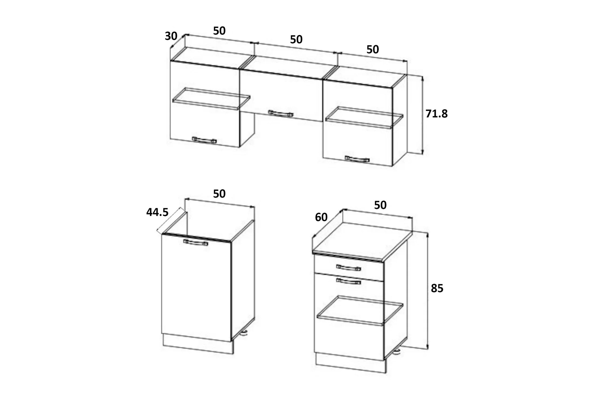 | В комплект входит | Верхние модули (ШхВхГ):, , ШВ 500 - 50 х 71.8 х 30 см - 2 шт., ШВГ 500/360 - 50 х 35.9 х 30 см - 1 шт., , Нижние модули (ШхВхГ):, , ШНМ 500 - 50 х 85 х 44.5 см - 1 шт., ШН1Я 500 - 50 х 85 х 44.5 см - 1 шт., , Столешница 50 см - 1 шт. |