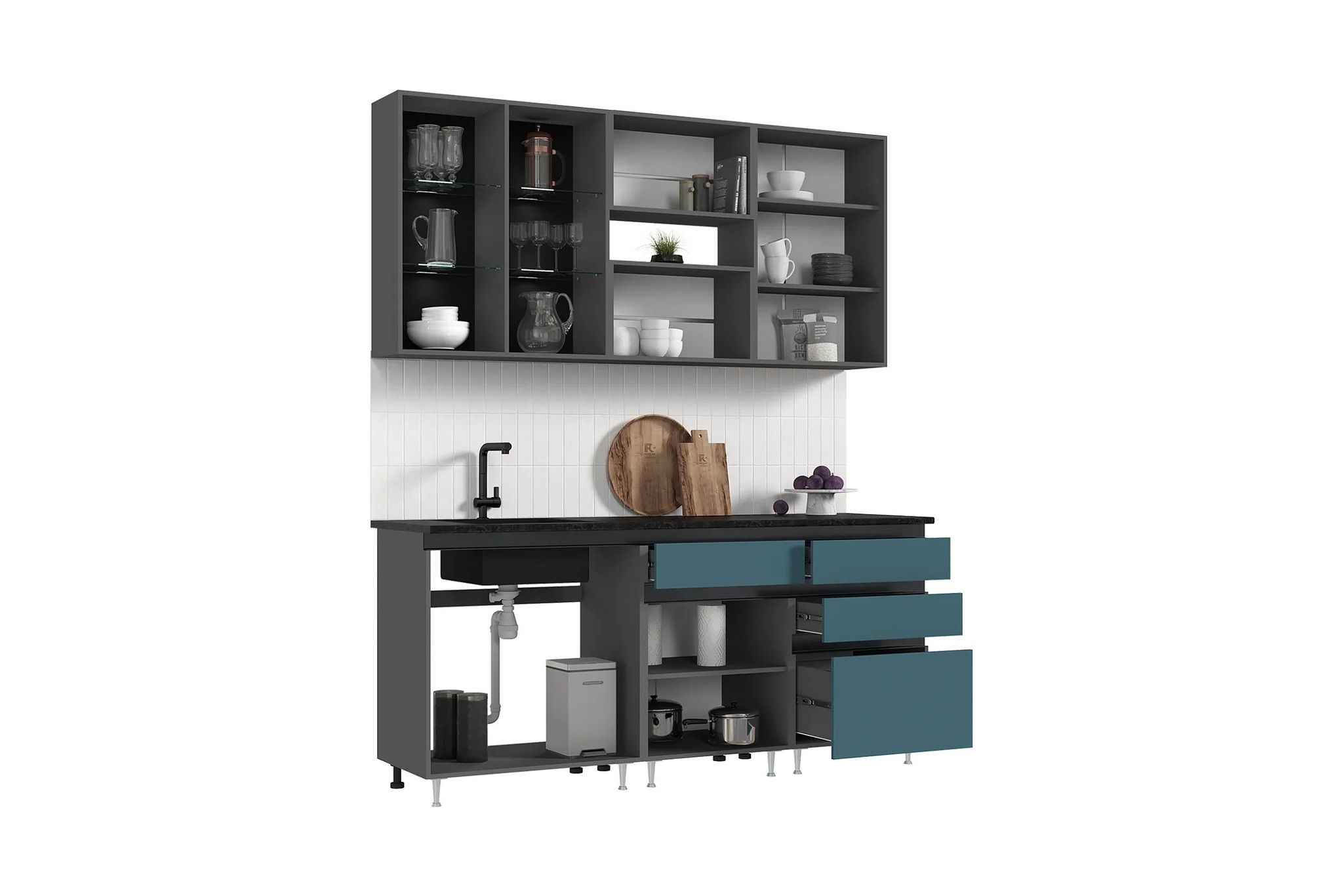 | Дополнительно | Высота нижних модулей указана с учетом толщины столешницы., Глубина модулей указана с учетом фасада., Цоколь в комплект не входит., Подсветка в комплект не входит., Материал опор: пластик., Указан цвет опор спереди., Цвет опор сзади: черный. |