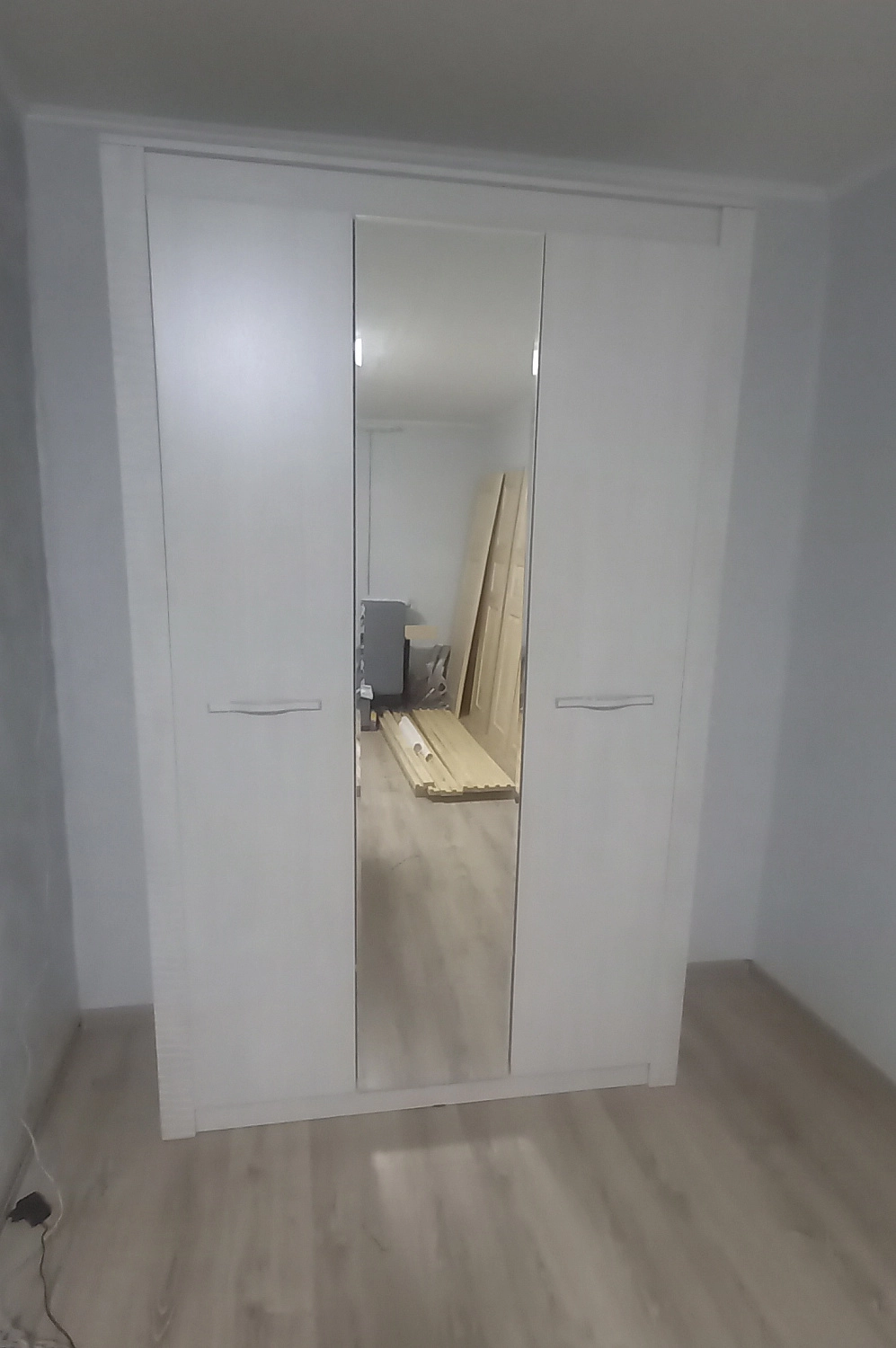 Трехстворчатая конструкция позволяет удобно разместить одежду как на полках, так и использовать горизонтальную штангу для вешалок с нагрузкой до 10 кг. Это даёт широкие возможности для хранения любых видов одежды, делая ваш гардероб легким в доступе и организации.
