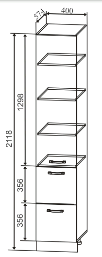 Пенал 400 - вместительная модель шириной 40 см с 2-мя ящиками, которая гармонично завершит композицию из верхних и нижних шкафов.
