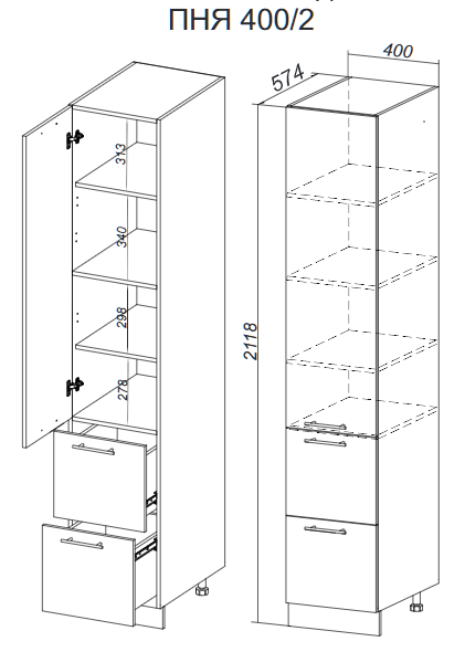 Кухонный модуль ПНЯ 400/2 - пенал, разделенный на две части фасадами. В верхней части