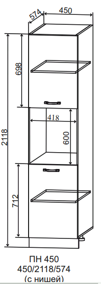 Пенал 450 - вместительная модель шириной 45 см, которая гармонично завершит композицию из верхних и нижних шкафов.