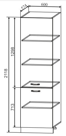 Пенал 600 - вместительная модель шириной 60 см, которая гармонично завершит композицию из верхних и нижних шкафов.