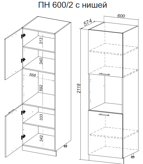 Пенал 600 - вместительная модель шириной 60 см, которая гармонично завершит композицию из верхних и нижних шкафов.