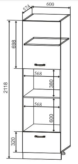 полки (вязки), между вязками ниша (568х600) для встраиваемого духового шкафа и ниша (568х378) для встраиваемой СВЧ печи, а в нижней - один выдвижной ящик