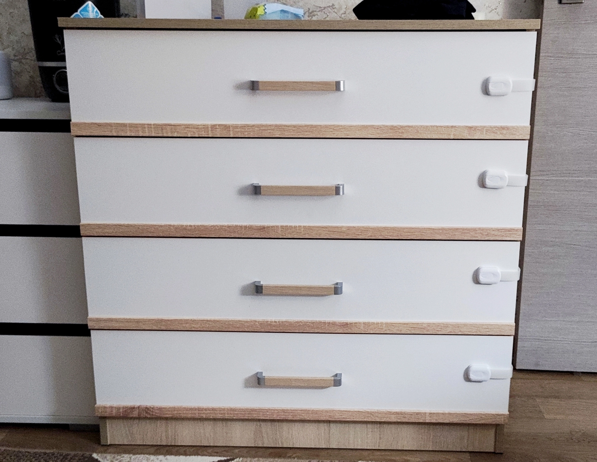 Комод оснащён практичными ручками, которые упрощают доступ к содержимому каждого ящика. Его конструкция из ЛДСП обеспечивает прочность и надёжность, делая его неотъемлемой частью вашего домашнего обихода, помогая поддерживать порядок и комфорт.