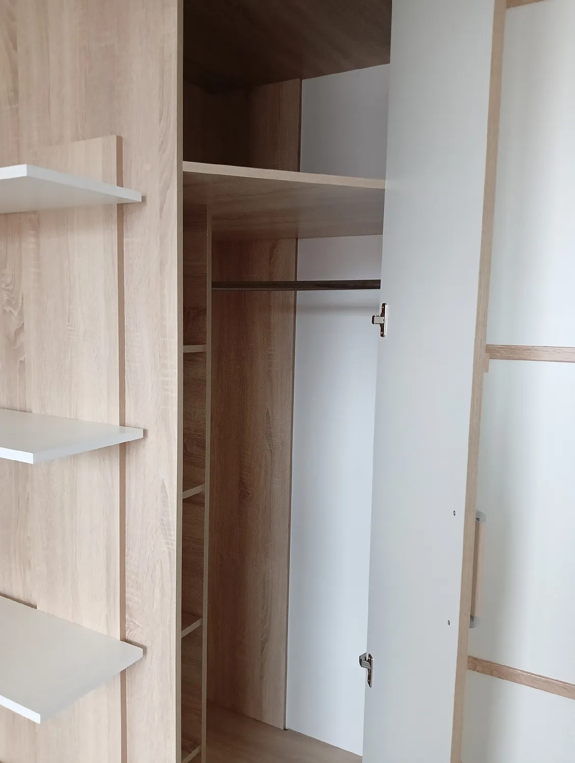 Этот угловой шкаф оптимально использует пространство в углу комнаты, предоставляя дополнительное место для хранения вещей. Его размеры 87.6х87.6 см позволяют избежать ощущения громоздкости, при этом обеспечивая достаточную вместительность. Он помогает создать порядок, позволяя аккуратно разложить одежду и другие бытовые предметы в ранее неиспользуемом месте.