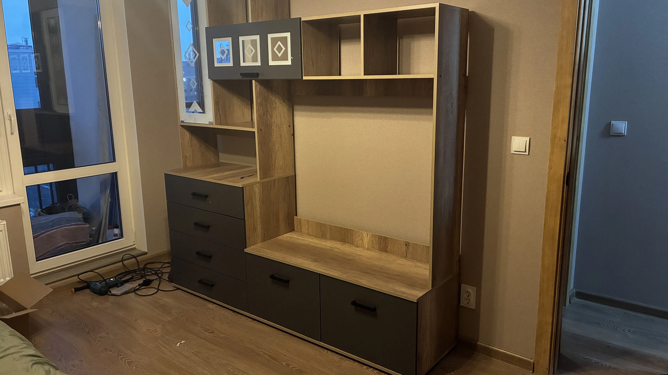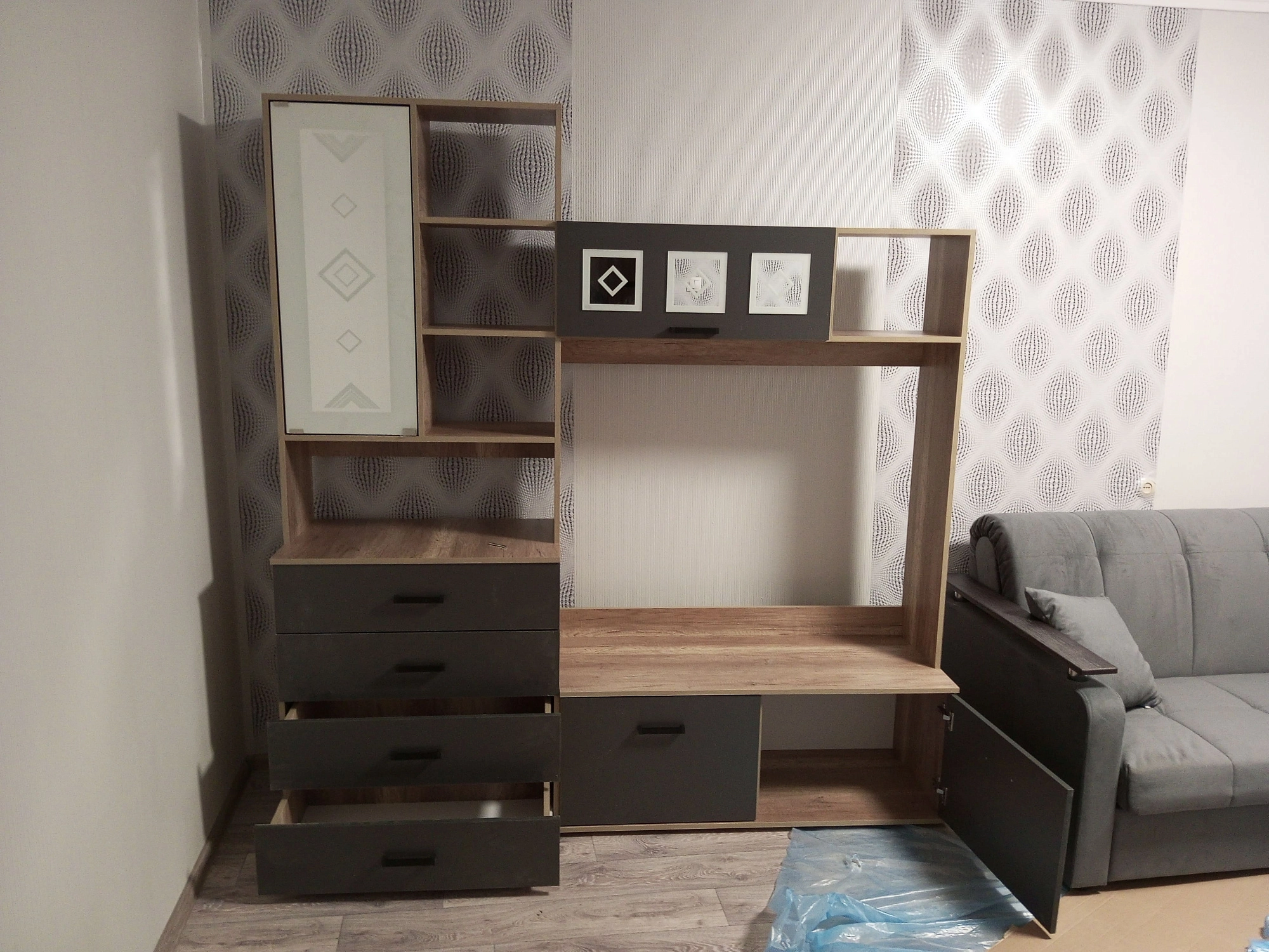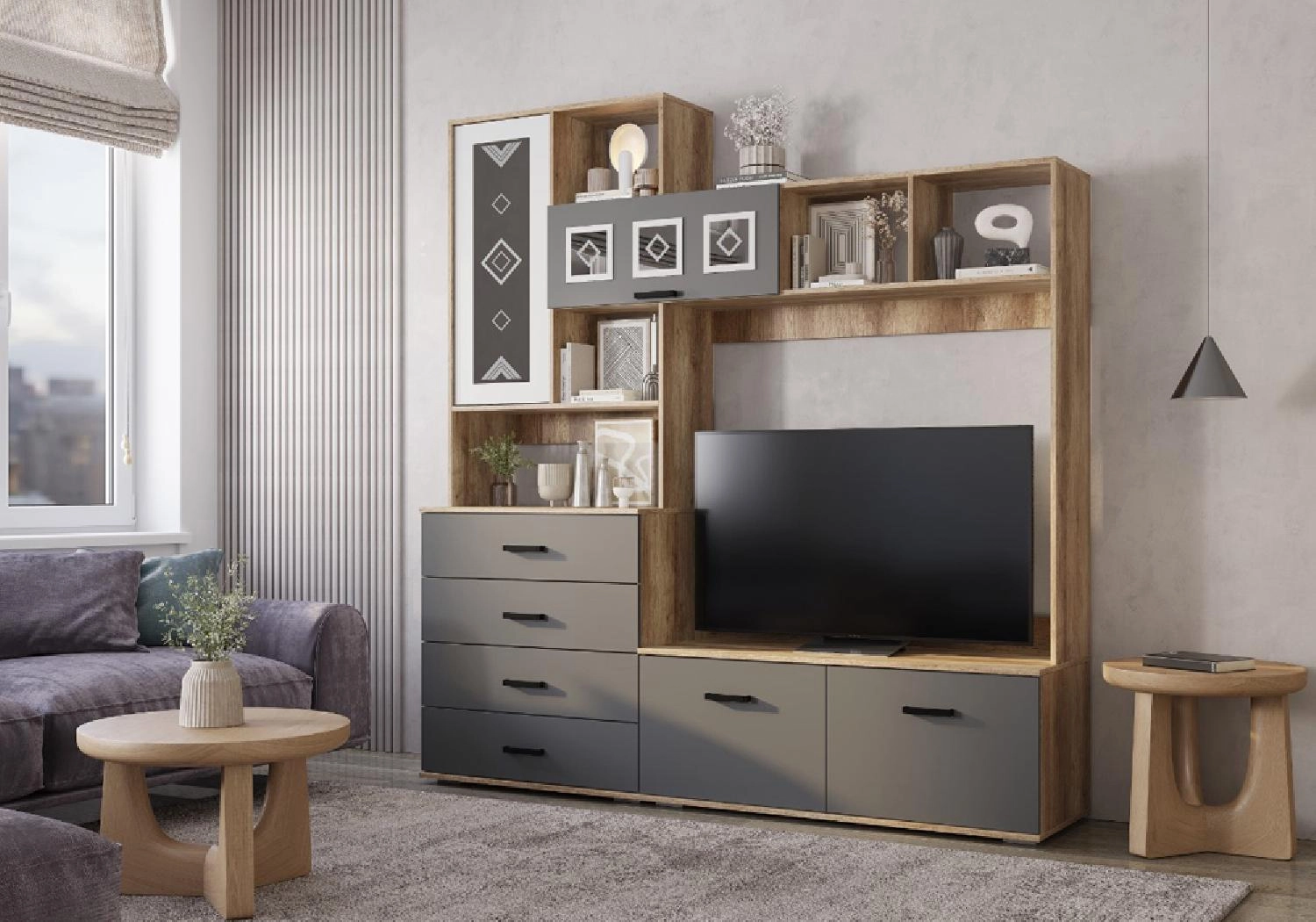 Порядок и уют в вашей комнате. Центральная секция "Вегас ЦС-03" помогает поддерживать порядок благодаря эффективной системе хранения. Четыре ящика отлично подходят для размещения небольших предметов — от проводов до пультов. Ниша высотой 102.4 см и шириной 118.5 см предназначена для телевизора и позволяет разместить дополнительную технику. Благодаря витрине и зеркальному фасаду создается визуальное расширение пространства и улучшается освещение комнаты. Как вписывается в современный интерьер? Дуб каньон в сочетании с графитом создают стильный современный образ: древесный оттенок добавляет тепла, а тёмный фасад — элегантности. Материалы из ЛДСП обеспечивают прочность и устойчивость конструкции в повседневном использовании. Практичные особенности. Секция оснащена ножками высотой 2 см. Пескоструйный узор придаёт дополнительный стиль, не перегружая пространство. Это важный нюанс для гармонии в гостиной. Полезная информация: Для дополнительной устойчивости предусмотрено крепление к стене. Универсальная сборка не предусмотрена, поэтому важно заранее выбрать подходящее место для установки. Следует отметить, что стойка для одежды и штанга для белья в комплект не входят, поскольку эта секция предназначена исключительно для гостиной.